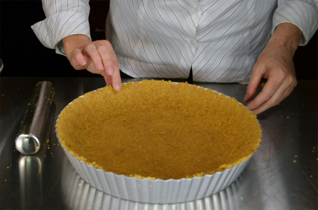 - Press into a 10″ tart pan. Try to make the crust about 1/4″ to 1/8″ (1/3 cm) evenly all around. If the crumb mixture won’t stick where you press them, just add another tablespoon of water to the mix. Even the crumbs up and make sure there are no gaps or holes. NOTE: If you chill the crust for an hour before you bake it, this will help prevent crumbling when you want to serve it.