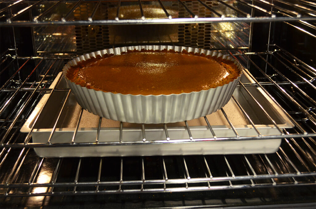 - Prepare a steam bath (to avoid a cracked top). Please 2″ water in sheet pan on lower rack of oven.
